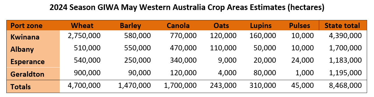 Canola area is going to be down from 2023 as growers held back sowing paddocks due to the dry conditions, and it is now close to being too late for these to go in. The lupin area is unlikely to be up from 2023 also due to the dry conditions. The oat area will be up from 2023 particularly in the lower rainfall regions where there was early rain. The wheat and barley swap in area could still vary depending on what happens with rainfall in the next three weeks.