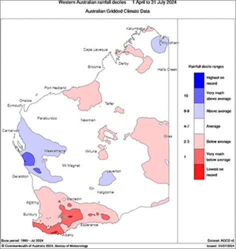 Figure 1: Rainfall deciles for April to July 2024. Source: Bureau of Meteorology (2024)