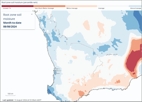 Figure 2: Estimated root-zone soil water percentiles at 8 August 2024. Source: Bureau of Meteorology (2024)