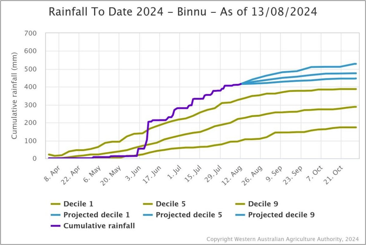 Figure 3: Cumulative rainfall from 1 April to 13 August 2024 at Binnu. Source: DPIRD