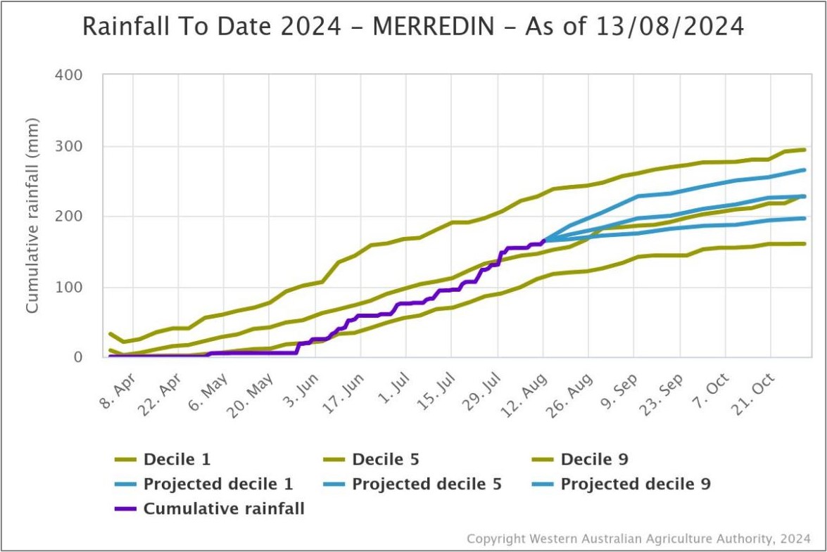 Figure 4: Cumulative rainfall from 1 April to 13 August 2024 at Merredin. Source: DPIRD