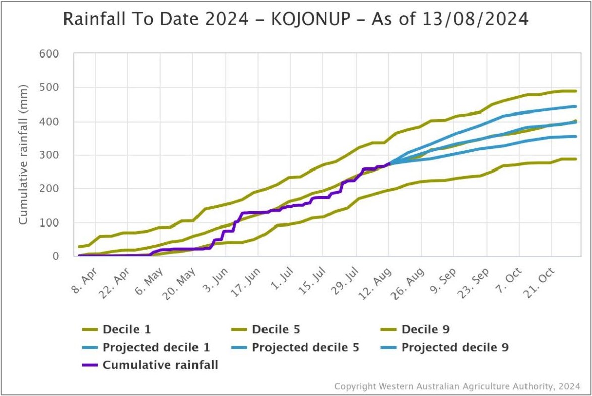 Figure 5: Cumulative rainfall from 1 April to 13 August 2024 at Kojonup. Source: DPIRD