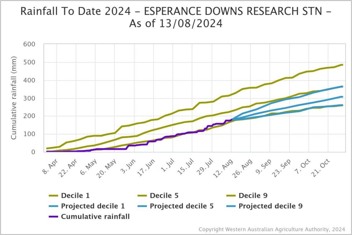 Figure 6: Cumulative rainfall from 1 April to 13 August 2024 at Esperance Downs Research Station. Source: DPIRD