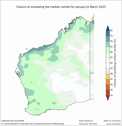 The Bureau of Meteorology’s seasonal outlook for January to March 2025 indicates above normal seasonal rainfall is more likely over much of WA (see Figure 2). Many international climate models have a neutral to a wetter outlook for this period. This is likely coming from warmer ocean temperatures around Australia.
