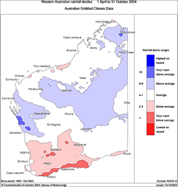 Figure 2: Rainfall deciles for April to October 2024. Source: Bureau of Meteorology (2024)