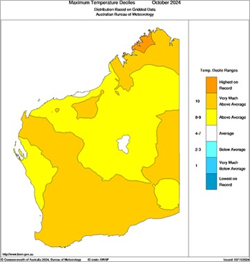 Seasonal temperatures throughout winter and spring to date have been very much above normal. Daytime temperatures during October have been well above average (Figure 3). Seasonal forecasts indicate warmer conditions will persist through summer.