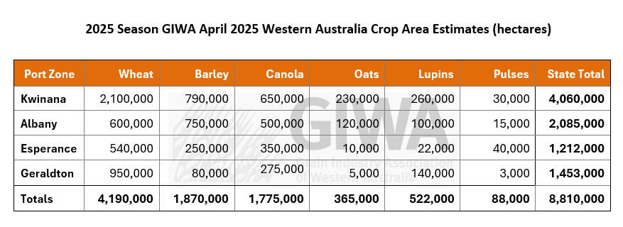 The wheat area in 2024 was up by around 500,000ha from 2023. Barley area was up by about 400,000 ha from 2023, and the canola area down by around 250,000ha. There was a large area of fallow sown to cereals in 2024 which is not available for plantings in 2025. The eventual splits on these three main crops will be determined over the next month. Whilst there is likely to be an increase in canola plantings, at the moment this will only occur if the rain showers we have been having over the last couple of weeks in the southern regions continue and the rainfall picks up in the northern regions of the state. Otherwise, growers will drop the break crops for the more secure cereals and drop more area out to fallow as occurred in 2023. As a result, the total area sown could easily hit 9 million hectares similar to last year with canola pushing well over the 1.8 million hectare mark if it rains. But, if it is dry and warm in May as forecast, crop area could drop back to 8.5 million hectares as it was in 2023.