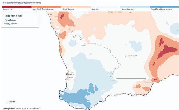 Figure 1: Estimated root-zone soil water storage 7 April 2025. Source: Bureau of Meteorology (2025)