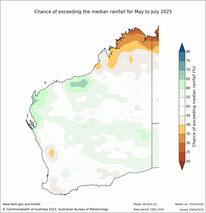 The Bureau of Meteorology’s monthly rainfall outlook for April expects below normal rain for most of southern WA, despite weather predictions of more rain for the South Coast mid-month. The seasonal outlook for May to July 2025 is neutral, meaning the normal range of rainfall can be expected (see Figure 2).