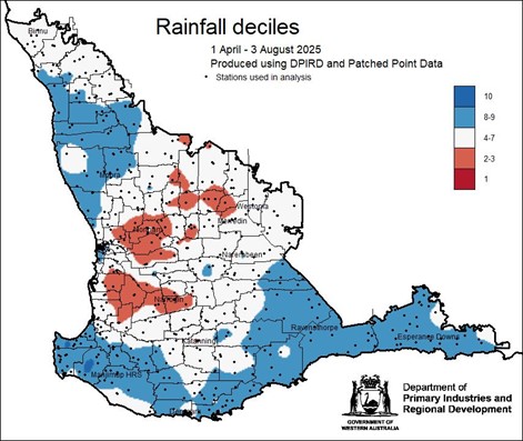 Figure 1: Rainfall deciles for 1 April to 3 August 2025. Source: DPIRD (2025)