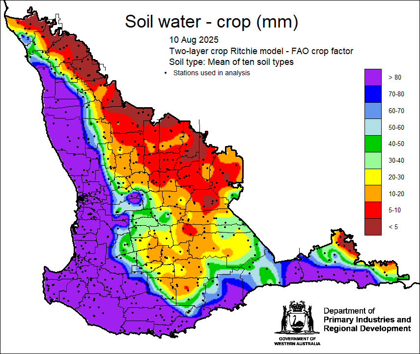 Soil water, Two-layer crop Ritchie model, 10 Aug 2025. Source: DPIRD (2025)