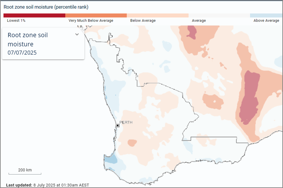 Figure 1: Estimated root-zone soil water storage rankings 7 July 2025. Source: Bureau of Meteorology (2025)