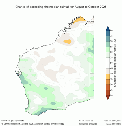 The Bureau of Meteorology’s monthly rainfall outlook for August indicates near-normal rainfall chances. The seasonal outlook for August to October 2025 is for normal or above normal rain being more likely (see Figure 2).