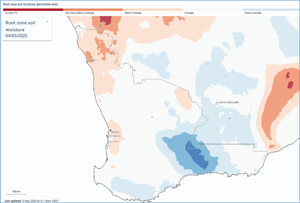 Figure 1: Estimated root-zone soil water storage 4 May 2025. Source: Bureau of Meteorology (2025)