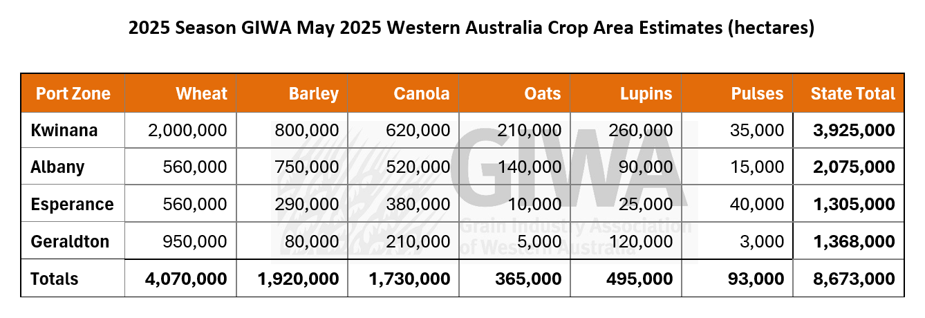 The total estimated crop area for Western Australia is slightly down from the April Crop Report due to the persistent dry conditions in the top third of the state’s grain growing regions. The drop off in crop area in the north is being compensated to some degree by extra crop area planted in the southern regions as a result of extra pasture paddocks being sown to crop, and less fallow in the low rainfall regions. There is likely to be a reduction in total crop area in the central regions now due to the patchy rainfall to date.