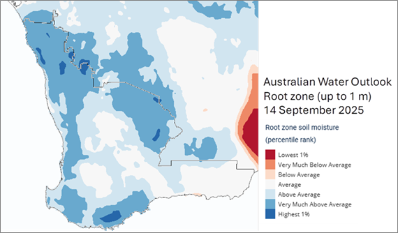 Figure 1: Estimated root zone relative soil water storage 14 September 2025. Source: Bureau of Meteorology (2025)